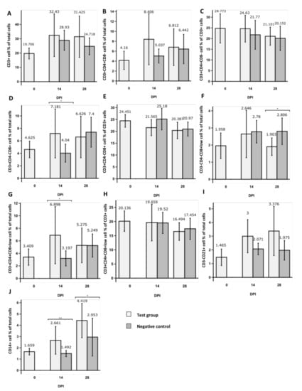 Mean values of CD3+ cell frequency were comparable between test and negative control groups and between 0 DPI (days post-initiation) and 28 DPI groups (Figure 2). No statistically significant differences in frequencies of CD3+CD4+CD8− cells within total tested cells or CD3+ cells were observed between 0 DPI and 28 DPI groups (Figure 2B,C). No statistically significant differences in frequencies of CD3+CD4−CD8+ cells within total tested cells were observed between 0 DPI and 28 DPI groups (Figure 2D). However, a significant (p < 0.05) decrease in CD3+CD4−CD8+ cells was observed within CD3+ cells between 0 DPI and 28 DPI groups (Figure 2E). Similarly, a statistically significant (p < 0.05) decrease in CD3+CD4+CD8+low cells was observed within CD3+ cells between 0 DPI and 28 DPI groups (Figure 2H), but not within total tested cells (Figure 2G). Interestingly, a statistically significant increase (p < 0.05) was observed between tested and negative control group CD3+CD4−CD8+ cell frequencies within total cells 14 DPI (Figure 3D), but not within total cells 28 DPI and within CD3+ cell population (Figure 3D,E). Similarly, a statistically significant increase (p < 0.05) was observed between tested and negative control group CD3+CD4+CD8+low cell frequencies within total cells 14 DPI (Figure 3G), but not within total cells 28 DPI and within CD3+ cell population (Figure 3G,H).