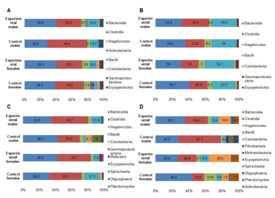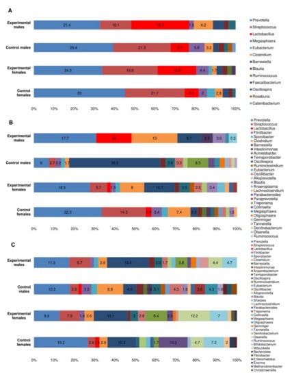 Bacteroidia and Clostridia remain the most prevalent bacterial classes in all animal groups 14 DPI, with statistically higher (p < 0.05) prevalence rates of Clostridia in test groups compared to negative controls (Figure 4C). Interestingly, the male control group expressed a different microbial profile, with the presence of Spirochaetia, Oligosphaeria, and Plantomycetia, which was not observed in other animal groups (Figure 4C). In addition, on the genus level, the male control group expressed predominance of Bernesiella (with the presence of a single species B. intestinihominis) with a prevalence rate of 36.5% compared to the prevalence rates ranging from 2.3% to 10.1% in other groups (p < 0.05) (Figure 5B). In addition, Treponema (T. succinifaciens) was only detected in the male control group (prevalence rate of 8.3%). Elevated Lactobacillus prevalence rate (10%) was significantly (p < 0.05) higher in the male test group, but not in control groups and in the female test group (Figure 5B).