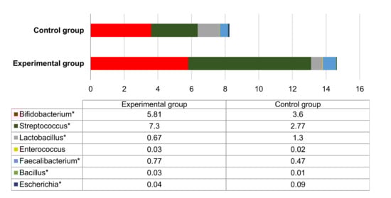 Generally, the number of bacteria that are considered to be probiotic was 1.78 times higher in test groups compared to negative controls (p < 0.05) (Figure 6). The prevalence of Escherichia and Lactobacillus was higher (p < 0.05) in fecal samples of control group animals compared to test groups (Figure 6).
