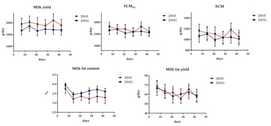 Mean milk performance of goats fed diets with 20 g Schizochytrium spp. and two different forage to concentrate ratios (20 HF; red line and 20 HG; blue line) throughout the experimental period. Error bars represent the standard error of the means (SEM). 20 HF: 20 g Schizochytrium spp. and high forage diet (60:40); 20 HG: 20 g Schizochytrium spp. and high grain diet (40:60).