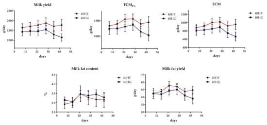 Mean milk performance of goats fed diets with 40 g Schizochytrium spp. and two different forage to concentrate ratios (40 HF; red line and 40 HG; blue line) throughout the experimental period. Error bars represent the standard error of the means (SEM). 40 HF: 40 g Schizochytrium spp. and high forage diet (60:40); 40 HG: 40 g Schizochytrium spp. and high grain diet (40:60).