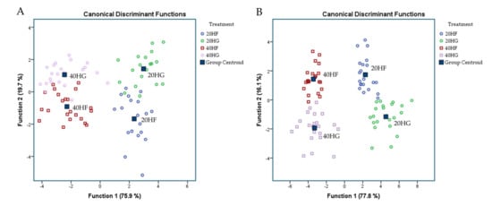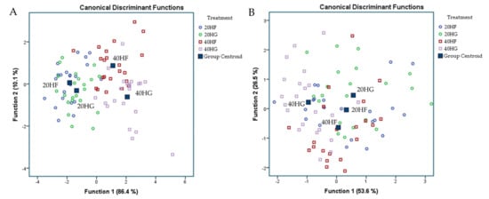 Figure 5A depicts a discriminant plot of blood plasma oxidative status of the four dietary treatments (20 HF; blue, 20 HG; green, 40 HF; red, and 40 HG; pink) throughout the experimental period. The proportions of the samples that were correctly classified were 71.6%. Wilks’ lambda was observed at 0.178 for Function 1 (p < 0.001) and 0.676 for Function 2 (p = 0.012), while the values of total antioxidant capacity using the FRAP method and the concentration of MDA were the variables that contributed the most based on a step wise method. The observation of blood oxidative status showed significant overlap, making it hard to conclude about a dependable classification. However, the centroids showed that the 20 HG and 20 HF groups were placed distanced from those of 40 HG and 40 HF. Figure 5B depicts the second discriminant plot of milk oxidative status of the four dietary treatments (20 HF; blue, 20 HG; green, 40 HF; red, and 40 HG; pink) throughout the experimental period. The proportions of the samples that were correctly classified were 52.3%. Wilks’ lambda was observed at 0.558 for Function 1 (p < 0.001) and 0.754 for Function 2 (p = 0.010), while the values of total antioxidant capacity using the ABTS method were the variable that contributed the most based on a step wise method. Despite the significance of the results (p < 0.05), the high Wilks’ lambda values and the severe overlapping of observations make it complicated to distinguish and classify samples amongst the four dietary groups