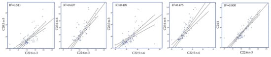 Figure 4 depicts the most significant correlations of milk fatty acids using a Pearson correlation. Eicosatrienoic acid (C20:3n3), arachidonic acid (C20:4 n-6), and nervonic (C24:1 n-9) acid were significantly (p < 0.01) positively correlated with DHA content in milk (R2 = 0.511, R2 = 0.607, and R2 = 0.800 respectively; Figure 4). The proportion of eicosatrienoic and arachidonic acid were also significantly (p < 0.01) positively correlated with DPA content in milk (R2 = 0.409 and R2 = 0.475 respectively; Figure 4).