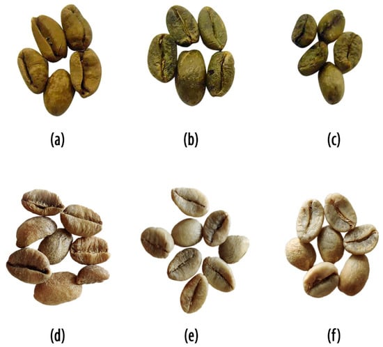 The study of Marcone [] is currently the most widely cited study on digested coffees according to Google Scholar (187 citations in June 2021). Marcone [] obtained Kopi Luwak and control beans (not having gone through the palm civet) from a supplier in California. Both the Kopi Luwak and control coffee beans were claimed as being Indonesian Coffea canephora var. robusta. The study also included African civet coffee collected in western Ethiopia. No species was provided for the Ethiopian coffee, which, however, should be assumed as being Coffea arabica, the predominant species in Ethiopia. Marcone [] provided photographs of the studied beans (reproduced in Figure 1a–c).