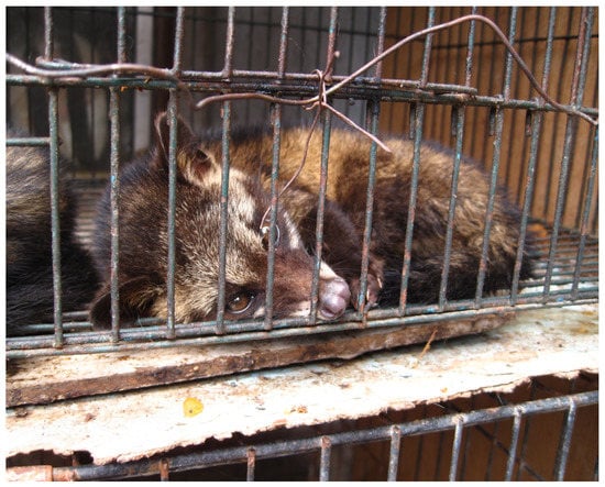Civet kept caged for Kopi Luwak production (attribution: author Surtr, (https://commons.wikimedia.org/wiki/File:Luwak_(civet_cat)_in_cage.jpg accessed on 8 June 2021) license CC BY-SA 2.0, (https://creativecommons.org/licenses/by-sa/2.0/ accessed on 8 June 2021) via Wikimedia Commons).