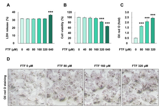 The cells treated with FTF at a concentration of 640 µM for 24 h had significantly higher LDH release levels than the control cells (P < 0.001; Figure 1A). In addition, the exposure of cells to 320 and 640 µM FTF for 24 h caused a significant decrease in cell viability, up to 83% and 65%, compared with the control cells, respectively (P < 0.001; Figure 1B). Thus, FTF at concentrations of 80, 160, and 320 µM was used for further experiments. FTF at a concentration of 640 µM was not used in further experiments because cell membrane damage had occurred. Moreover, FTF treatment to cells induced prominent lipid accumulation in the cytoplasm, compared with the control cells (P < 0.001; Figure 1C,D).
