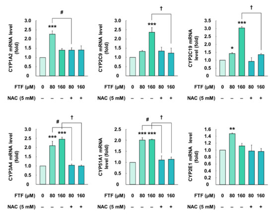The cells treated with FTF (80 and 160 µM, for 24 h) had significantly higher mRNA expression of CYP1A2, CYP2C9, CYP2C19, CYP3A4, CYP51A1, and CYP2E1 than control cells (P < 0.05; Figure 2). However, the cells treated with the antioxidant NAC (5 mM, for 1 h) had significantly lower mRNA expression of CYPs than those treated with FTF alone (P < 0.05). These results showed a correlation between the activation of CYP and the generation of cellular oxidative stress in human liver cells.