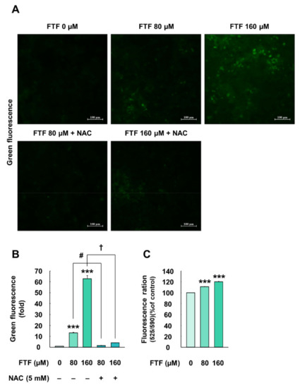 Intracellular ROS levels were estimated using 2,7-dichlorofluorescein diacetate (DCFDA; Sigma-Aldrich, St. Louis, MO, USA). HepG2 cells were grown in 6-well plates and exposed to 80 and 160 µM FTF or 0.004% DMSO (vehicle control) for 24 h with or without pretreatment with NAC (5 mM; in PBS) for 1 h (n = 3 wells per group). The cells were then treated with 10 µM DCFDA and incubated at 37 °C in a 5% CO2 incubator for 30 min. The cells were then washed thrice with PBS. The green fluorescence area stained with DCFDA was imaged using Nikon Eclipse Ti2-U and the fluorescence intensity was quantified using ImageJ software.