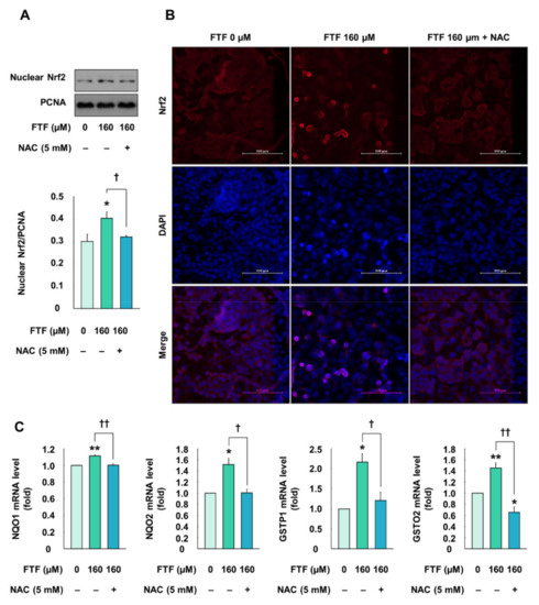 Cells treated with FTF (160 µM, for 24 h) showed significantly increased transfer of Nrf2 from the cytosol to the nucleus, compared with the control cells (P < 0.05; Figure 4A). However, cells pretreated with NAC (5 mM, for 1 h) showed a decreased nuclear translocation, compared with FTF alone-treated cells (P < 0.05). Furthermore, the fluorescence microscopy images were confirmed that Nrf2 proteins were translocated from the cytosol to the nucleus in FTF-treated cells, which was reversed by NAC treatment (Figure 4B). Therefore, the expression levels of antioxidant enzyme genes associated with Nrf2 were determined in HepG2 cells. Treatment of cells with FTF (160 µM, for 24 h) significantly increased mRNA expression of NAD(P)H quinone oxidoreductase (NQO) 1, NQO2, glutathione S-transferase (GSTP) 1, and glutathione S-transferase omega (GSTO) 2 (P < 0.05; Figure 4C). However, the cells pretreated with NAC (5 mM, for 1 h) had significantly lower mRNA expression levels of these antioxidant enzymes than the cells exposed to FTF alone (P < 0.05).