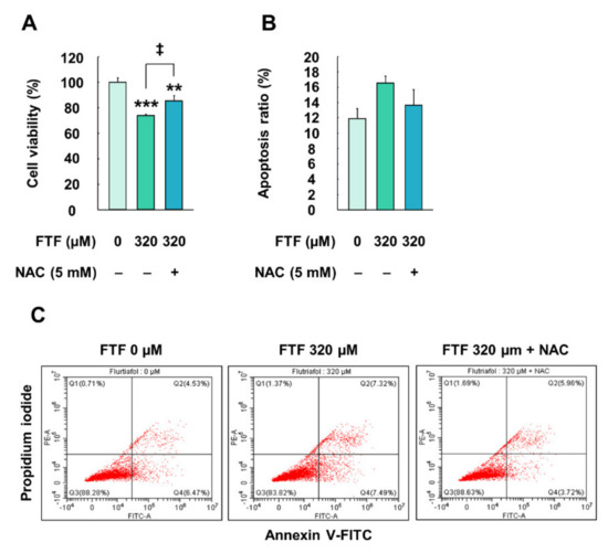 HepG2 cells exposed to FTF (320 µM, for 24 h) showed significantly lower cell viability than the control cells (P < 0.05; Figure 5A). However, NAC (5 mM, for 1 h)-pretreated cells had significantly higher cell viability than the cells treated with FTF (P < 0.05). Furthermore, the flow cytometry data displayed that the apoptotic ratio (early apoptotic and late apoptotic cells) increased after treatment with 320 µM FTF for 24 h (Figure 5B,C). This apoptotic ratio decreased to the control level in the cells pretreated with NAC, compared with cells treated only with FTF.