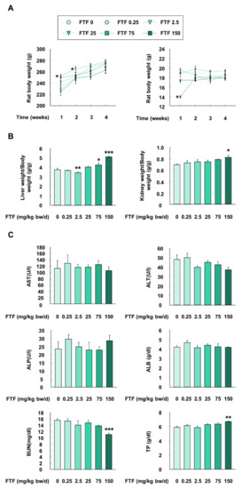 An animal study was performed with rats to provide further evidence for FTF-induced liver metabolism and apoptosis. Although the rats treated with FTF (2.5 mg/kg bw/day) had significantly higher body weight than control rats at 1 and 2 weeks (P < 0.05), there was no statistically significant difference in body weight among the treatment groups from 3 weeks (Figure 6A). In addition, although the rats treated with 150 mg/kg bw/day FTF had significantly lower levels of feed intake than the control rats (P < 0.05), the feed intake levels recovered after 1 week (Figure 6A). The rats treated with 75 and 150 mg/kg bw/day FTF had a significantly increased liver weight/body weight ratio than the control rats (P < 0.05; Figure 6B). The rats treated with 75 and 150 mg/kg bw/day FTF had significantly increased kidney weight/body weight ratio than the control rats (P < 0.05). Regarding biochemical parameters, there were no significant differences in the rats treated with FTF (0–150 mg/kg bw/day) and the control rats, with regard to the plasma levels of AST, ALT, ALP, and ALB (Figure 6C). However, the rats treated with the highest dose of FTF (150 mg/kg bw/day) had a significantly lower level of BUN and a higher level of TP than the control rats (P < 0.01).