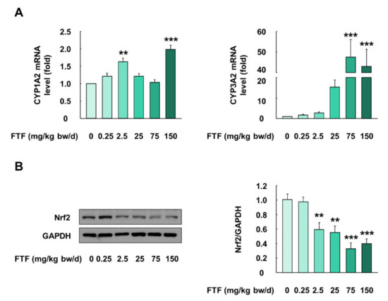 FTF-treated rats showed changes in organ weight/body weight ratio and biochemical profile, and hence, metabolism studies related to FTF were conducted using rat liver (Figure 7A,B). Liver samples collected from FTF-treated rats (0–150 mg/kg bw/day) showed higher mRNA expression levels of CYP1A2 and CYP3A2 than those of control rats (P < 0.01; Figure 7A). In particular, the expression level of CYP3A2 was markedly higher than that of CYP1A2 (Figure 7A). Furthermore, the liver samples collected from FTF-treated rats (2.5–150 mg/kg bw/day) had a significantly lower protein level of Nrf2 than those from the control rats (P < 0.01; Figure 7B).