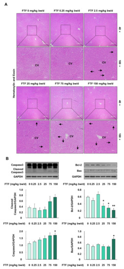 Rat liver samples were histologically evaluated by hematoxylin and eosin staining (Figure 8A). The liver samples collected from rats treated with FTF at a concentration of 0.25 mg/kg bw/day showed normal liver architecture with no histopathological alteration, compared with the control rats. However, FTF (2.5–150 mg/kg bw/day) treatment induced fatty infiltration in rat liver tissue, and the severity of liver steatosis remarkably increased in the rat livers (75 and 150 mg/kg bw/day FTF) (Figure 8A). In addition, protein expression levels related to crucial mediators of apoptosis (Caspase3 and cleaved Caspase3) were increased in the FTF (75 and 150 mg/kg bw/day)-treated rat livers, compared to control rat livers (Figure 8B). Moreover, the FTF-exposed rat livers had a significantly lower protein expression level of Bcl-2 and a higher protein expression level of Bax (P < 0.05).