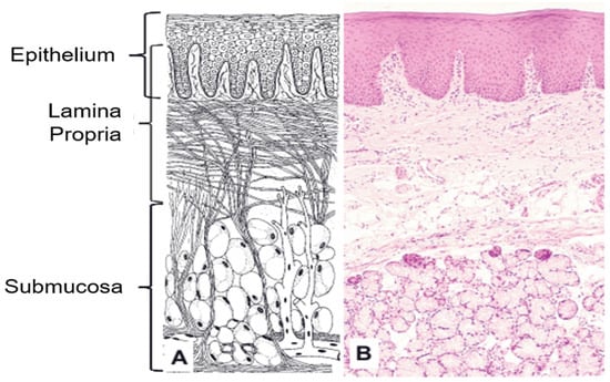 (A) Schematic diagram of the oral mucosa; (B) histological section of the hard palate to show the tissue components (Reprinted with permission from Chen et al., 2015 [9]).