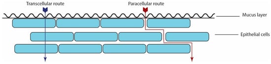 Oral epithelial cell membranes are lipophilic; however, the space between the epithelial cells is hydrophilic and results in hydrophilic and lipophilic regions. Accordingly, the penetration of drugs across the oral mucosa follows a passive diffusion process by paracellular route (transport of drug through the intercellular spaces between the cells) and transcellular route (transport of molecule across the cells). Figure 2 depicted the transport pathways in the oral mucosa. Researchers suggested that hydrophilic molecules choose a paracellular route, and lipophilic molecules preferentially penetrate through the transcellular route [17,18]. Fick’s law of diffusion can be applied for the drug absorption process (Equations (1) and (2)):