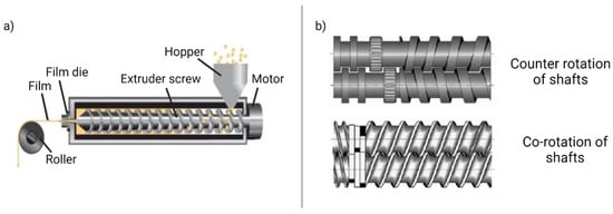 Hot-melt extrusion technique. (a) Production of buccal film; (b) counter-rotation and co-rotation of shafts (Reprinted with permission from Karki et al. 2016 [57]).