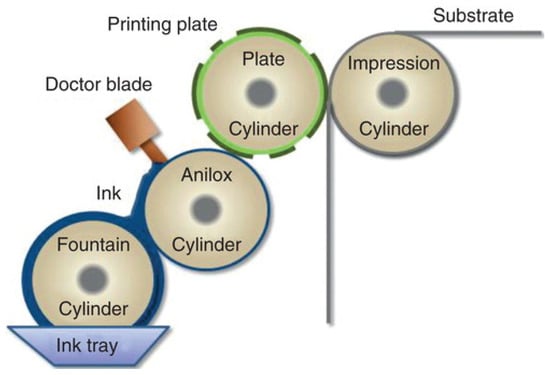 Flexographic printers (roll-to-roll printer) is most widely used for printing newspapers and magazines due to its flexible substrate options including paper, plastic, acetate film, and foil. The schematic representation of flexographic printing techniques is given in Figure 6. For film formulation, the pharmaceutical ink is loaded to anilox rollers to provide a measured amount of ink to the printing rollers. However, the use of flexographic printing is difficult in the pharmaceutical sector due to the requirement of organic solvent (in higher ratio) for drug solubilization and the inherent risk of precipitation and activity loss [70,71].