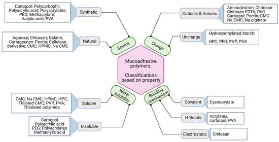 Although diffusion of therapeutic compounds through the mucus is complex and controlled by many variables, including the size, charge, and wettability of the drug, it is required to analyze the most influencing parameter for the mucoadhesive property. Based on the mucoadhesion theories, readers can understand that the mucoadhesive property can be tailored by altering the interaction between polymer and mucosal surface. Mucoadhesive polymers are employed in pharmaceutical formulations since 1947 when Scrivener and Schantz [83], was trying to formulate a penicillin delivery system using gum tragacanth and dental adhesive powders. Later, the potential application of various polymers (e.g., sodium alginate, sodium carboxymethylcellulose, guar gum, hydroxyethylcellulose, methylcellulose, poly(ethylene glycol) (PEG), retene and tragacanth) found to exhibit mucoadhesive properties [84].