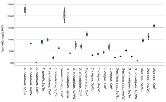 Box plots showing the Total AHCs content (ug/g DW) in different seaweeds species. Sp: Spring; Su: Summer; Au; Autumn; Wi: Winter; Cm a: Commercial wild origin; Cm b: Commercial aquaculture origin.