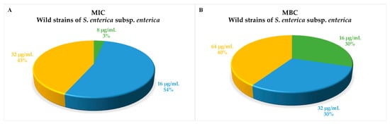 Distributions of Minimum Inhibitory Concentration (A) and Minimum Bactericidal Concentration (B) values among strains of S. enterica subsp. enterica are shown in the pie chart as a percentage of serovars related to a specific peptide dose.