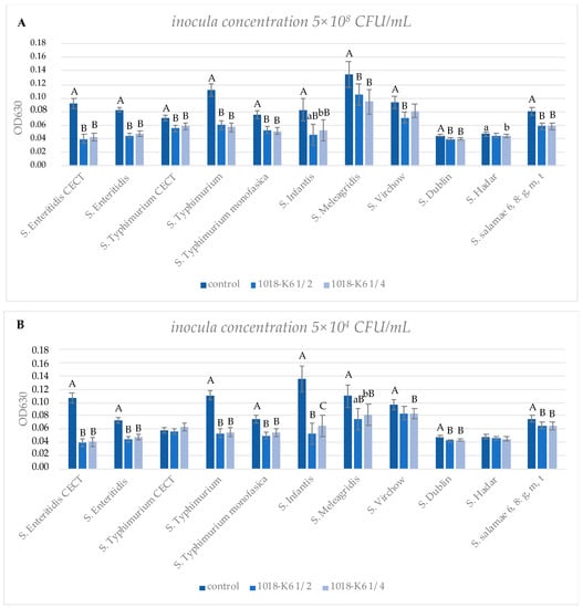 Antibiofilm activity of 1018-K6 on 11 strains of S. enterica from inocula of 108 CFU/mL (A) and 104 CFU/mL (B). Bacterial cells were grown under biofilm conditions in the absence (control) or presence of the peptide at a concentration of ½ and ¼ of the corresponding MIC values for each strain (1018-K6 ½ and 1018-K6 ¼, respectively). Statistical analysis was performed only within each strain, comparing the control with each treated bacterial sample. Average OD630 values are shown with error bars representing the standard error of four independent replicates. Different superscript uppercase letters indicate a significant difference within each strain at p < 0.01. Different superscript lowercase letters indicate a significant difference within each strain at p < 0.05.