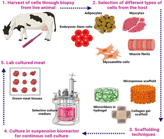 In addition, multipotent cells of adipose tissue called adipose tissue-derived adult stem cells (ADSCs) were found suitable for in vitro meat production [36]. These cells were identified and isolated from the subcutaneous fat and had the potency to consequently transdifferentiate into varied cell types such as myogenic, osteogenic, chondrogenic, or adipogenic cell lineages [37]. In parallel, the cell ceiling method was developed based on the dedifferentiated fat (DFAT) cells that originated from mature adipocytes [38]. These cell lines are exclusively capable of transdifferentiating into skeletal myocytes and serve as a potential alternative for naive stem cells [39]. In addition, fresh stem cells obtained through biopsy from live animals from any organs such as mammary glands and liver can be employed for culture in specific mediums in bioreactors. In compliance to the religious laws (e.g., Halal, Kosher), stem cells can be harvested from recently slaughtered animals, provided the tissues are be viable. However, the major challenge associated with the cell lines is the self-renewal and uninterrupted proliferative capacity. Mimicking conventional meat is truly challenging, and it typically involves tissue-engineering protocols to provide a scaffold to support the organization of the cells and assemblage of tissues that closely match in the nutrition and flavor of real meat [40].