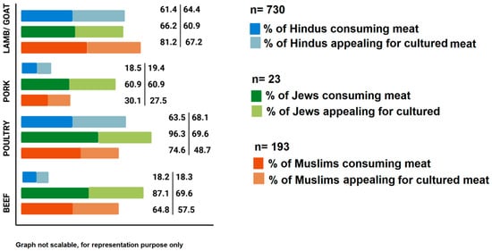 Recent surveys on the acceptance of cultured meat across several countries involving Australia, China, England, France, Germany, Mexico, South Africa, Spain, Sweden, and the US suggested that there was a large cultural difference associated with it [71]. The demographic profile of meat consumers based on religion constitutes 1.8 billion Muslims, 1.1 billion Hindus, 0.5 billion Buddhists, and 10 million Jews [72]. In vitro meat tailored from live animal cells has the challenge and prospects to convince several social–ethical, eco-friendly, and public health issues. Yet, overcoming and advocating for sensitive issues such as religious acceptance remains a great task [18]. Figure 2 illustrates the percentage of three religious populations (Hinduism, Islam, and Judaism) having appeal towards artificially grown meat. Convincingly, laboratory-engineered meat does not come from a present live animal, and it, therefore, abides by the religious laws such as Jhatka, Halal, etc. [10]. Judaism and Islam unanimously approved that cultured meat is Kosher [73] and Halal [74], respectively, provided the cells of the slaughtered animal are harvested in an ethical way. However, Hinduism and Buddhism have several principles of non-violence, which encourage a vegan diet, and a feeble percent of Hindus prefer cultured meat as most encourage the harmless killing of animals for food [75]. However, the consumption of beef is prohibited, as they consider cows to be sacred.