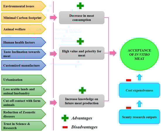 The utilization of forest covers for grazing and fuel are directly linked with livestock rearing for meat production. The promotion of in vitro meat can certainly influence the reduction in the exhaustion of forest resources and support environmental sustainability for the long term. Moreover, it also becomes a great way of restoring the endangered animals pertaining to their ecosystem and intensely promotes the hotspot quality of a nation. In other words, this technology can prevent wildlife poaching activities for the exotic meat of animals. Since cells can be cultured in a lab using stem cells, the culture of exotic meat is also possible. This directly reduces the threats to wild animals from being extinct. It is reported that the conventional global marketing of rare and endangered animal meat is alarming and has reduced the wild populations of many rare species in many countries [62]. Figure 3 explains the overall governing factors and the hurdles for the acceptance of cultured meat.