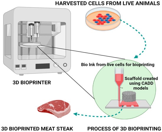 The 3D printing of muscle is characterized by cell distribution and alignment and synchronization in the contraction; however, critical challenges include the biochemical compatibility, resolution, and throughput [96]. A recent study reported that the choice of bioprinter nozzle, pressure, and shear stress influence the growth and differentiation of the cells in the case of mouse myoblast cell culture (C2C12); in addition, the mechanical properties of “meat-ink” are also a determining factor of the 3D-printable meat products [97]. Overall, the advantages include the speed of production, customization of forms, homogenous distribution of nutritional content (protein, fat) [98], and easy of handling even in space stations [99]. In 2021, an Israeli concern, “Aleph farms” for the first time produced the 3D bioprinted rib-eye steak for the first time [100]. Figure 4 illustrates the incorporation of 3D bioprinting with in vitro meat technology.