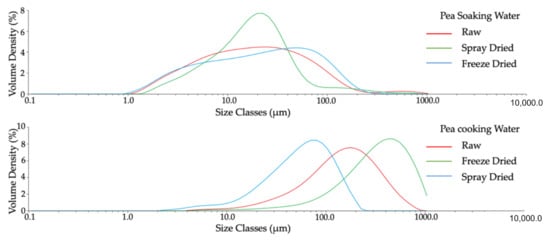 This is also demonstrated in Figure 2, where spray-drying is shown to have significantly decreased the size of large particles to below 100 μm, with the peak particle size at about 20 μm. In addition, the majority of the particles in spray-dried pea powder diluted water were distributed from about 1 to 50 μm. Additionally, freeze-drying did not much change the size of small particles in pea soaking water. However, more large-size particles were formed in split yellow pea soaking water after freeze-drying. Similar results were found in pea cooking water (Figure 3). With the application of spray-drying, more particles in spray-dried split yellow pea cooking water were distributed in the smaller size classes compared with those in split yellow pea raw cooking water. On the other hand, more large-size particles were formed in split yellow pea cooking water after freeze-drying.
