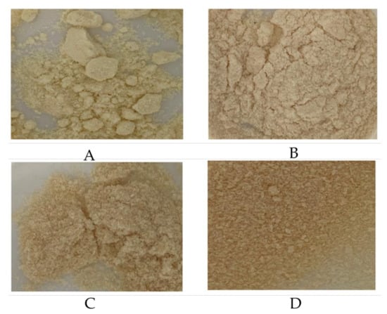 Pictures of the pea water powders. (A) Spray-dried pea soaking powder, (B) Spray-dried pea cooking powder, (C) Freeze-dried pea soaking powder, (D) Freeze-dried pea cooking powder.