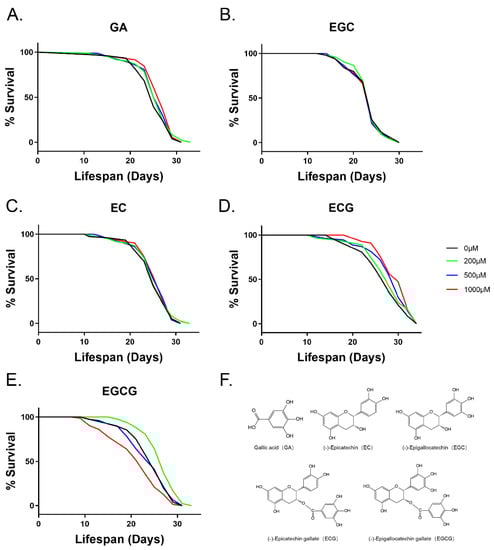Survival of wild-type C. elegans treated with polyphenols. (A) GA, (B) EGC, (C) EC, (D) ECG, and (E) EGCG tested at different concentrations (200, 500, and 1000 μM) for their ability to change the lifespan of the worms. (F) Molecular formulae of GA, EGC, EC, ECG, and EGCG. Survival rates were recorded every other day until all worms died (n = 90–105 worms/treatment). Statistical analysis using the log-rank (Mantel–Cox) test showed that the changes in the survival curves of 500 and 1000 μM ECG compared with the control group were significant (p < 0.05).