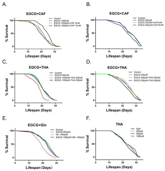 Survival of wild-type C. elegans treated with EGCG (200 and 1000 μM), caffeine (CAF) (5 and 10 m M), theanine (THA) (200, 500, and 1000 μM), and glutamine (Gln) (1000 μM). (A,B) Survival curves with EGCG and caffeine; (C,D) survival curves with EGCG and theanine; (E) survival curves with EGCG and glutamine. (F) Theanine was tested at different concentrations to evaluate its ability to change the lifespan of the worms. Survival was recorded every other day, until all worms died (n = 90–105 worms/treatment).