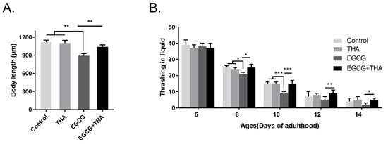 Body length and locomotion behavior were used as aging-associated indicators to assess the lifespan of C. elegans. To further verify the effect of theanine on hormesis induced by EGCG, we evaluated the nematode body lengths and bends. Theanine treatment had no effect on motility or body size. High-dose EGCG caused a significant decrease in motility and body size, while theanine showed an obvious protective effect (Figure 3A,B). Taken together, these results demonstrate that theanine improves hormesis induced by a high dose of EGCG.