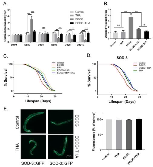 Previous studies have shown that EGCG-induced lifespan extension of nematodes is related to ROS production [9]. Here, we found a transient increase in ROS formation after 2 days of exposure to high-dose EGCG, and a persistent decrease in ROS was observed at 8 days and beyond (Figure 4A). The addition of theanine restored the ROS levels to that of their age-matched controls (Figure 4A). To verify whether this ability of theanine was analogous to the antioxidant N-acetylcysteine (NAC), we evaluated whether the lifespan of worms treated with high-dose EGCG could be prolonged by adding 5 mM NAC. NAC abolished the EGCG-induced increase in ROS levels and prolonged the lifespan of the nematodes (Figure 4B,C, Table S3). This shows that theanine improves the lifespan of high-dose EGCG by eliminating excess ROS generation. However, theanine exhibited activity in SOD-3 mutants (GA186), which ameliorated the high dose of EGCG-induced lifespan shortening (Figure 4D, Table S3), while no effect was observed on the expression of SOD-3::GFP (Figure 4E). Theanine treatment alone had no influence on SOD-3 mutants and the expression of SOD-3::GFP. Thus, the activity of theanine in improving high-dose EGCG-induced lifespan reduction is due to the elimination of dynamic changes in ROS levels, not directly related to SOD-3.