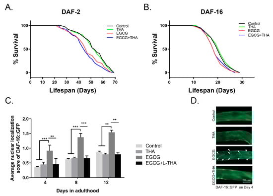 DAF-16 is a forkhead transcription factor (FoxO) involved in resistance, lifespan, and metabolism in a variety of organisms, including worms, flies, and rodents [40]. The role of DAF-16 in lifespan extension induced by EGCG may be dependent on the insulin signaling pathway [41]. In our study, high-dose EGCG shortened the lifespan of SOD-3 (Figure 4D), DAF-2-, and DAF-16-mutants (Figure 5A,B), suggesting that the lifespan reduction induced by high-dose EGCG may not be entirely dependent on the insulin receptor pathway. DAF-16 is activated during normal aging and accumulates at an accelerated rate in response to stress. In N2 worms, nuclear DAF-16 accumulates in older but not in young animals [24]. The accumulation of DAF-16 is accelerated earlier under external stress conditions such as high temperature and oxidative stress [42]. This suggests that the activation of DAF-16 might be driven by aging. High doses of EGCG triggered the nuclear localization of DAF-16 in wild-type worms and caused its aggregation in early to mid-adulthood (Figure 5C), suggesting that high doses of EGCG accelerate the aging process in worms. Theanine alleviated high-dose EGCG-induced nuclear accumulation of DAF-16 in early to mid-adulthood (Figure 5C), thereby delaying aging. Meanwhile, theanine did not alleviate the shortened lifespan of DAF-2- and DAF-16-mutants induced by high-dose EGCG (Figure 5A,B). This suggests that theanine regulated the high-dose EGCG-induced lifespan reduction through an insulin-related pathway.