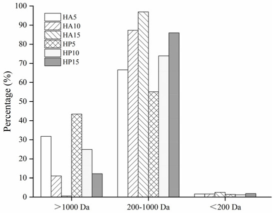 The antioxidant activity of protein hydrolysates is closely associated with molecular weight (MW) [30]. Accordingly, compared to those macromolecular peptides, the peptides containing fewer than 10 amino acid residues usually had higher antioxidant activities [1] due to their easier access to, and greater capacity to scavenge free radicals [31]. The MW distribution of fish bone protein hydrolysates of Alcalase (HA) and Protamex (HP) with a DH of 5%, 10% and 15% is shown in Figure 1. The samples were divided into three fractions (>1000 Da, 1000–200 Da, <200 Da). The proportion of high MW peptides in HP and HA decreased with increasing DH, which was accompanied by an increase in the proportion of low MW peptides. In addition, the amounts of low MW peptides in HA were higher than those in HP at the same degree of hydrolysis. This indicated that Alcalase had a higher hydrolysis efficiency on fish bone than Protamex. Protamex was a mixture of endo- and exoproteases, while Alcalase was comprised of endoproteases with broad specificities for peptide bonds [32]. Different proteases have different cleavage sites, resulting in differences in hydrolysis efficiency. As shown in Figure 1, all the proportions of MW (200–1000 Da) peptide in six samples accounted for more than 50% of the total. In particular, the HA sample with a DH of 15% contained the largest percentage (96.92%) of low MW substances between 200 and 1000 Da, followed by HA (10% DH) and HP (15% DH), with respective proportions of 87.31% and 85.95%. These hydrolysates had high percentages of low MW peptides, suggesting that they might have higher antioxidant properties.