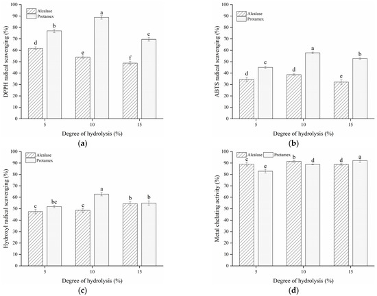 The hydrolysates produced by different enzymes had different amino acid sequences, leading to varied DPPH radical scavenging abilities. As shown in Figure 2a, the hydrolysates obtained from Protamex with a DH of 5%, 10% and 15% showed a higher DPPH radical scavenging activity, with values ranging from 69.63% to 88.79% compared to those of Alcalase. DPPH in ethanol could be scavenged by substances with proton donors [30]. This indicates that HP (especially with a DH of 10%) might have some amount of special amino acids that function as proton donors, thereby exhibiting a higher DPPH radical quenching ability [33]. Additionally, the antioxidant activity of bone hydrolysates is highly related to the degree of hydrolysis. Although low molecular weight peptides exhibit stronger oxidant inhibition activity than larger ones, the antioxidant capability of peptides might decline when they are further hydrolyzed into free amino acids [31].