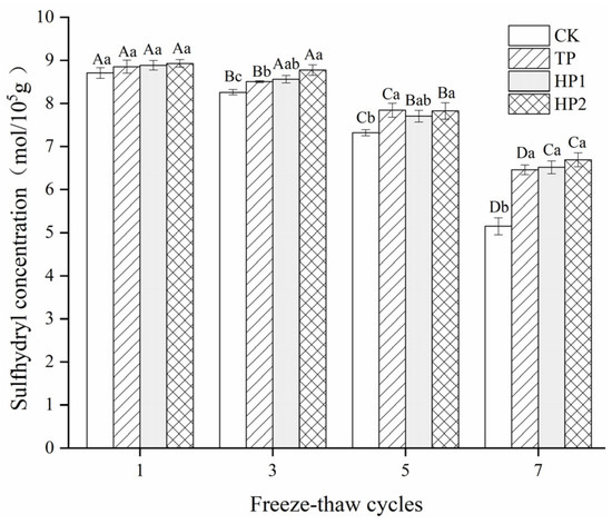 Changes in sulfhydryl contents of freeze-thawed fish fillets: CK: fillets in distilled water; TP: fillets in tea polyphenol; HP1: fillets in 1% bone hydrolysates; HP2: fillets in 2% bone hydrolysates. Different capital letters indicate the results that differ significantly in freeze–thaw cycles with the same treatment (p < 0.05). Different lowercase letters indicate the results that differ significantly with different treatments in the same freeze–thaw cycle (p < 0.05).
