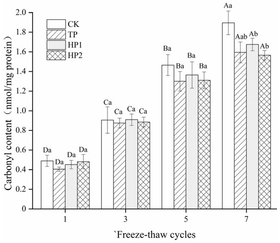 Changes in carbonyls’ contents in freeze-thawed fish fillets: CK: fillets in distilled water; TP: fillets in tea polyphenol; HP1: fillets in 1% bone hydrolysates; HP2: fillets in 2% bone hydrolysates. Different capital letters indicate the results that differ significantly in freeze–thaw cycles with the same treatment (p < 0.05). Different lowercase letters indicate the results that differ significantly with different treatments in the same freeze–thaw cycle (p < 0.05).