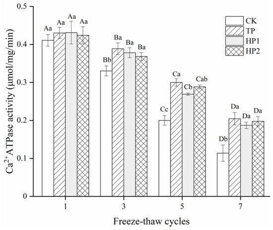 Changes in Ca2+-ATPase activity of freeze-thawed fish fillets: CK: fillets in distilled water; TP: fillets in tea polyphenol; HP1: fillets in 1% bone hydrolysates; HP2: fillets in 2% bone hydrolysates. Different capital letters indicate the results that differ significantly in freeze–thaw cycles with the same treatment (p < 0.05). Different lowercase letters indicate the results that differ significantly with different treatments in the same freeze–thaw cycle (p < 0.05).