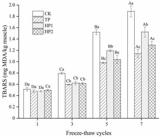 Changes in TBARS of freeze-thawed fish fillets: CK: fillets in distilled water; TP: fillets in tea polyphenol; HP1: fillets in 1% bone hydrolysates; HP2: fillets in 2% bone hydrolysates. Different capital letters indicate that the results of the same treatment differ significantly in freeze–thaw cycles (p < 0.05). Different lowercase letters indicate that the results of different treatments differ significantly in the same freeze–thaw cycle (p < 0.05).