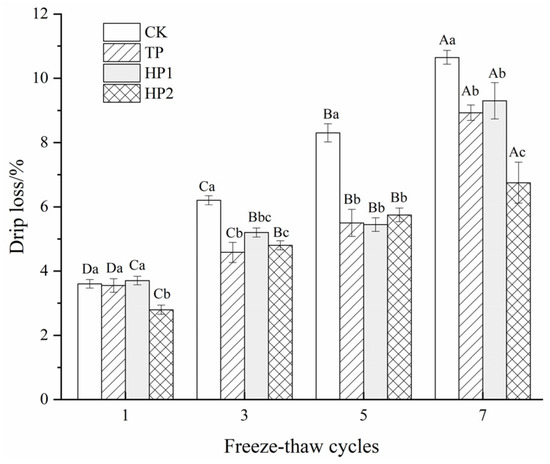 Changes in drip loss of freeze-thawed fish fillets: CK: fillets in distilled water; TP: fillets in tea polyphenol; HP1: fillets in 1% bone hydrolysates; HP2: fillets in 2% bone hydrolysates. Different capital letters indicate that the results differ significantly in freeze–thaw cycles with the same treatment (p < 0.05). Different lowercase letters indicate that the results differ significantly with different treatments in the same freeze–thaw cycle (p < 0.05).