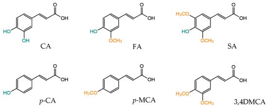 Phenylpropenoic acids commonly found in foods in the terms of chemical structure are hydroxy and methoxy derivatives of cinnamic acid. The most widespread like caffeic acid (CA), ferulic acid (FA), synapic acid (SA), p-coumaric acid (p-CA), p-methoxycinnamic acid (p-MCA) and 3,4-dimethoxycinnamic acid (3,4DMCA) are shown in Figure 1. These compounds are present in many food products, but berries, cereal, beverages and spices are considered as their richest sources [6,7,8]. The first one, caffeic acid (CA), is mainly present in coffee [9] and regular drinking of this beverage can supply from 250 to 500 mg of CA per day [10]. Coffee is also a valuable source of methoxy derivatives of cinnamic acid such as p-MCA and 3,4DMCA (690 mg/kg dry weight of coffee beans) [9]. Synapic acid (SA) and p-coumaric acid (p-CA) are compounds in which significant amounts have been determined in fruits [11]. Black mulberry fruits (1448 mg/kg dry weight) and strawberries (1107 mg/kg dry weight) are particularly rich sources of p-CA, while synapic acid has been found mainly in apples and pears, and its content can range from 15 to 600 mg/kg dry weight depends on their species [11]. Ferulic acid is commonly found in cereal raw materials such as corn, barley, wheat, rice and whole-grain bread where its content reaches up to 330 mg/kg of dry weight [12].
