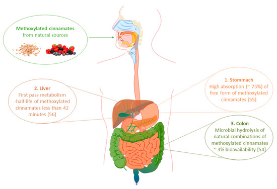 The therapeutic effect and possibility of the practical application of phytochemicals as therapeutic agents significantly depends on their bioavailability, understood as the concentration in which the compounds reach the general circulation in an unchanged form. This, in the first line, depends on their solubility and permeability through the gastrointestinal tract. One of the main parameters affecting the degree of absorption of cinnamic acid derivatives in the human body is their chemical structure. Kern et al. carried out a study to determine the bioavailability of ferulic acid (FA) from food [53]. For this purpose, they determined the concentration of this compound that appeared in the blood of volunteers after consumption of a meal consisting of cereal bran, containing 22.5 μM FA per kg of their body weight. The maximum concentration of the compound (expressed as the sum of its metabolites) that was observed in peripheral blood was only 0.2 μM/L 180 min after consumption of the meal. However, the total amount determined in urine, the main route of FA excretion from the body, was about 3% in relation to the amount ingested with food. Such a low content of FA in plasma is caused by its limited absorption from the gastrointestinal tract due to its chemical form of occurrence in natural sources. As it was mentioned earlier, phenolic acids rarely occur in natural sources in the free form. Most of these compounds occur in combinations with mono-, di-, and polysaccharides, sterols, polyamines, glycoproteins, and lignins that form the structure of plant cell walls. Such combinations are not metabolized by human digestive enzymes. Release of free acids and consequently also absorption occurs only as a result of hydrolytic enzymes of intestinal microflora [53]. A diagram showing the absorption of dietary methoxy derivatives of phenylpropenoic acids in the human body is presented in Figure 2.