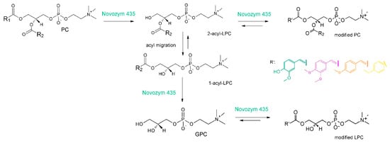 In recent years, in our research team, we reported studies on the chemical synthesis of phosphatidylcholines containing in their structure O-methylated phenolic acid as acyl fragments. In vitro studies confirmed for these conjugates higher antiproliferative activity towards selected human cancer cell lines: MV4-11 (leukemia), A549 (lung cancer), MCF-7 (breast cancer), LoVo (colorectal cancer), LoVo/DX (drug-resistant colorectal cancer) and HepG2 (liver cancer) than for free forms of corresponding acids [83,84]. Additionally, their selectivity of action was also confirmed in tests carried out towards normal cells of mouse fibroblasts line Balb/3T3. Subsequent studies revealed also their higher ability to induction of glucose-stimulated insulin secretion and intracellular calcium mobilization in the MIN6 β pancreatic cell line being at the same time not toxic for these cells at active doses [85]. Balakrishna et al. also described increased antioxidant potential obtained as a result of chemo-enzymatic synthesis of phospholipids structured with ferulic, synaptic, vanillic and syringic acid [86], whereas Anakanbil et al. successfully applied chemo-enzymatic synthesis pathway to obtain 1-acyl-2-caffeoyl and 1-caffeoyl-2-acyl PC [87]. A two-step enzymatic reaction of the synthesis of lysophosphatidylcholine containing ferulic acid was proposed by Yang [88]. In this report, the researchers first enzymatically hydrolyzed natural soy phosphatidylholine and then transterified obtained lysophosphatidylcholine with ethyl ferulate in a reaction catalyzed by Novozym 435. Ferulated lysophospholipids were also further successfully produced during one-step lipase-catalyzed transesterification of egg yolk PC with higher reaction yield [89]. Moreover, in the following years, methoxylated phenolic acids such as p-methoxy [90], 3,4-dimethoxy [91] and anisic acid [92] were successfully introduced into phospholipid structure via Novozym 435-catalyzed acidolysis or transesterification reaction (Figure 3).