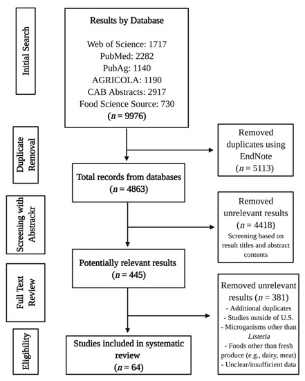 The study selection process was conducted by co-author Townsend. Results from database searches were exported to EndNote (Version X9, Clarivate, Philadelphia, PA, USA). Duplicate results were removed in EndNote using the “Find Duplicates” function after importing search results from each individual database. The remaining results were screened for relevance using a free, open-source web tool Abstrackr [26], which maintains a digital paper trail on screening decisions. Abstracts were rejected if they did not contain specified review terms (e.g., “Listeria,” “produce,” “fresh,” “fruit,” “prevalen”). Screening results from Abstrackr were downloaded as a CSV file containing the assigned Abstrackr (internal) ID, source ID, PubMed ID, keywords, abstract, title, journal, authors, tags, and screening decision for each study. Abstrackr assigned a score of -1 (rejected), 0 (unsure), or 1 (accepted) for the reviewer’s screening decisions. Studies were re-screened in Excel (Microsoft Corp., Redmond, WA, USA) to verify correct screening decisions through Abstrackr by examining titles and abstracts. Duplicates not identified through EndNote were also removed manually during re-screening. Studies receiving a score of 0 or “unsure” were reviewed using the full text if the title and abstract were not sufficient to gauge relevance. After re-screening, results were filtered to those with a score of 1 and were examined using the full text. Full text review evaluated whether the study included fresh produce or was directly related to the fresh produce supply chain stages. Exclusion characteristics included studies completed outside of the U.S. and focus on microorganisms other than Listeria. Experimental studies evaluating isolation and/or detection methods were not included if samples did not contain naturally occurring Listeria species from produce-related environments or Listeria isolates from fresh produce or from previous fresh produce-associated outbreaks. An overview of the systematic review process can be seen in Figure 1.