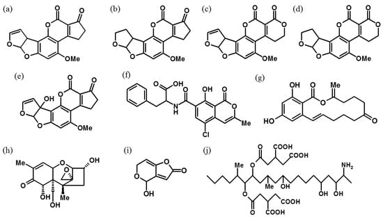 The chemical structures of (a) aflatoxin B1, (b) aflatoxin B2, (c) aflatoxin G1, (d) aflatoxin G2, (e) aflatoxin M1, (f) ochratoxin A, (g) zearalenone, (h) deoxynivalenol, (i) patulin and (j) fumonisin B1.