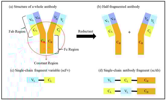 An antibody is one such conventional molecular recognition element, and is a well-established component in analyte detection due to the specific antibody–antigen interaction. It comprises a fragment crystallisable (Fc) region and an antigen-binding fragment (Fab) region that are made up of two heavy chains (H) and two light chains (L), as illustrated in Figure 2a [,].