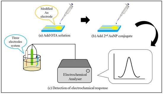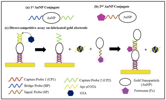 Most of the aptasensors that use AuNPs for electrode surface modification exploit the use of a blocking agent, such as 6-mercapto-1-hexanol (MCH), in order to inhibit unintentional adsorption to exposed areas of the electrode surface. An extremely low LOD of 1.37 × 10−6 µg kg−1 was obtained with a wide linear range of 1 × 10−5 to 10 µg kg−1 for ZEN detection []. MCH is also used to ensure the linear structure of probe DNA strands in some aptasensors []. Aptasensors based on DPV often require a signal amplifier in addition to surface modification, as shown in Table 5. This is because the DPV current signal arises from an electrochemical reaction that is dependent on oxidation and reduction rates []. Most DPV aptasensors exhibit indirect detection of mycotoxin, whereby the oxidation or reduction is attributed to the competitive activity between the mycotoxin and a signal producing agent, as shown in Figure 3. For instance, Chen et al. [] developed a DPV aptasensor by utilising the formation of an OTA–Apt complex that caused the OTA–Apt to dissociate from the modified electrode and to be replaced by a conductive conjugate, ferrocene-tagged AuNPs, as illustrated in Figure 4. Two AuNP conjugates were synthesised for electrode surface modification and signal amplification, respectively. The first AuNP conjugate was used for modification of the Au electrode surface. It was composed of a bridge probe (BP) that hybridised with the pre-coated capture probe (capture probe 1, CP1) on the Au electrode, an AuNP and another capture probe (capture probe 2, CP2), as shown in Figure 4a. Figure 4b depicts the second AuNP conjugate, which act as the signal amplifier in the assay. All the probes are thiolated DNA strands, which can bind to the Au surface via Au-S bonds. The competitive activity occurs between the OTA and the ferrocene-tagged AuNPs in the hybridisation with CP2, as shown in Figure 4c. The DNA duplex of CP2 and Apt will dissociate in the presence of OTA due to the higher affinity of Apt for OTA, thus enabling the hybridisation of CP2 and BP from the second AuNP conjugate. Therefore, the intensity of the cathodic current is directly proportional to the OTA concentration [].